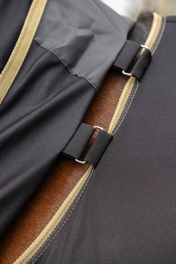 Aftagelige, elastiske benstropper forhindrer tæppet i at glide, mens det aftagelige halsstykke er nemt at fastgøre med velcrolukninger. En stor haleklap giver ekstra beskyttelse, og brystområdet er foret for ekstra komfort.