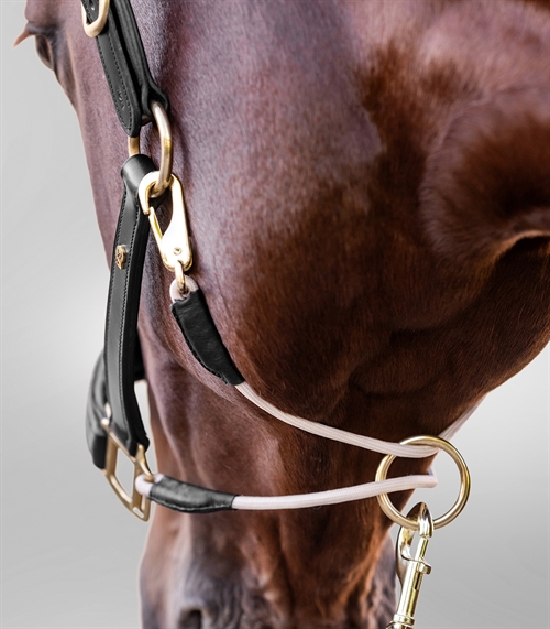 Hals- og hageremmene er lavet af fint reb. Begge dele er forbundet med en roterende ring, der sikrer en sikker pasform og forhindrer glidning.